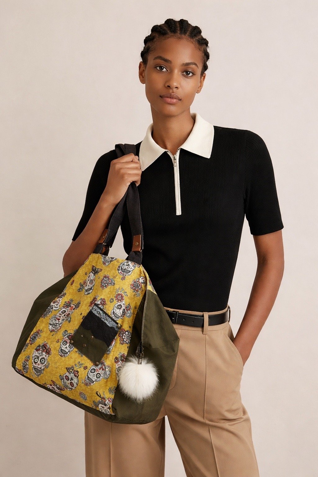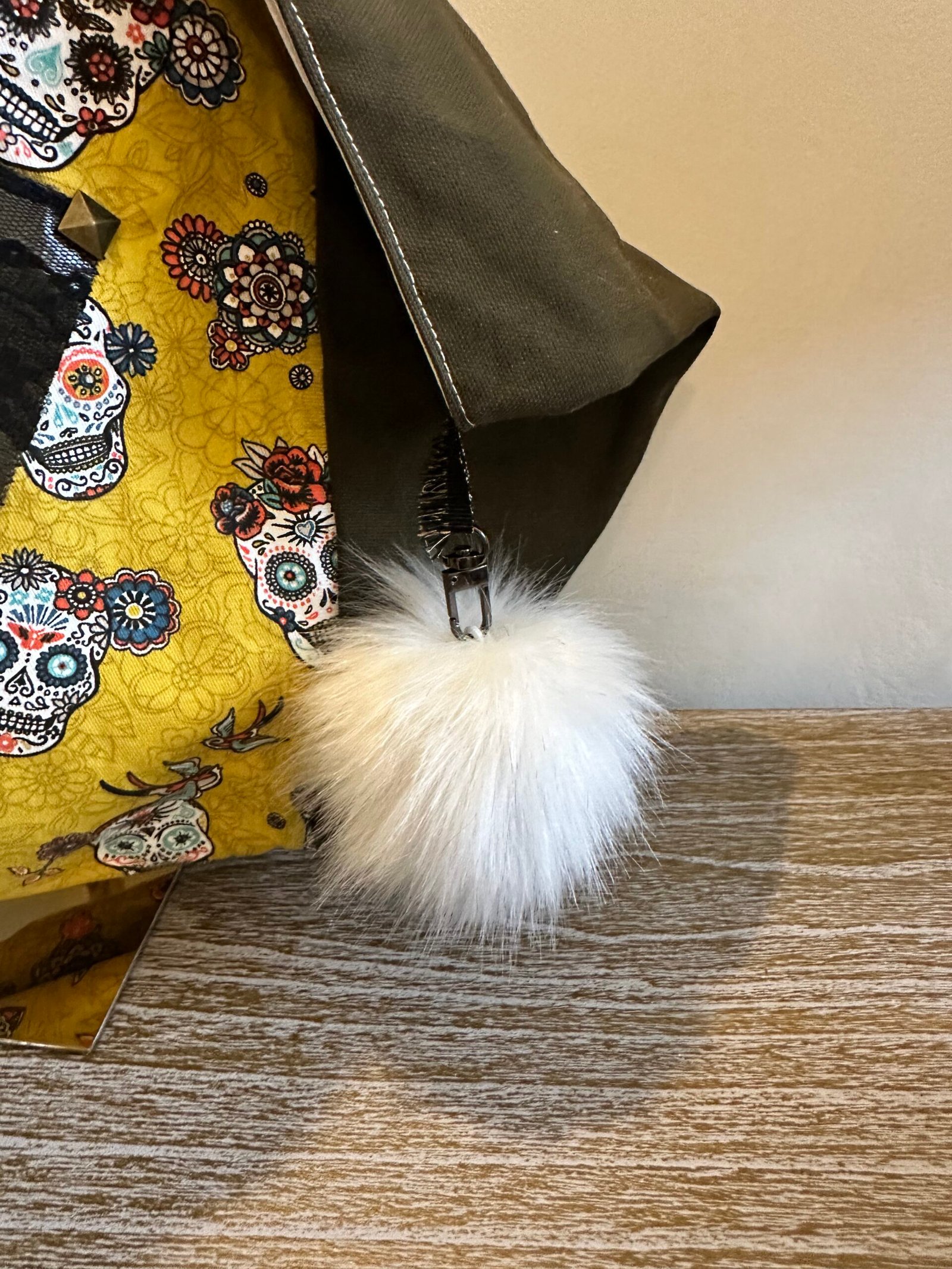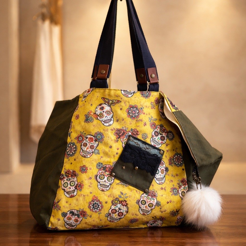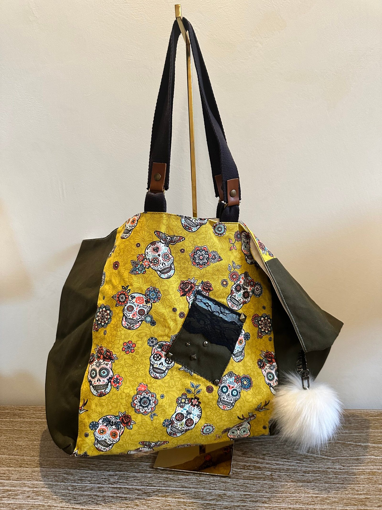 Sac cabas kaki toile tête de mort jaune – Grand sac tendance avec pompon et poche intérieure
