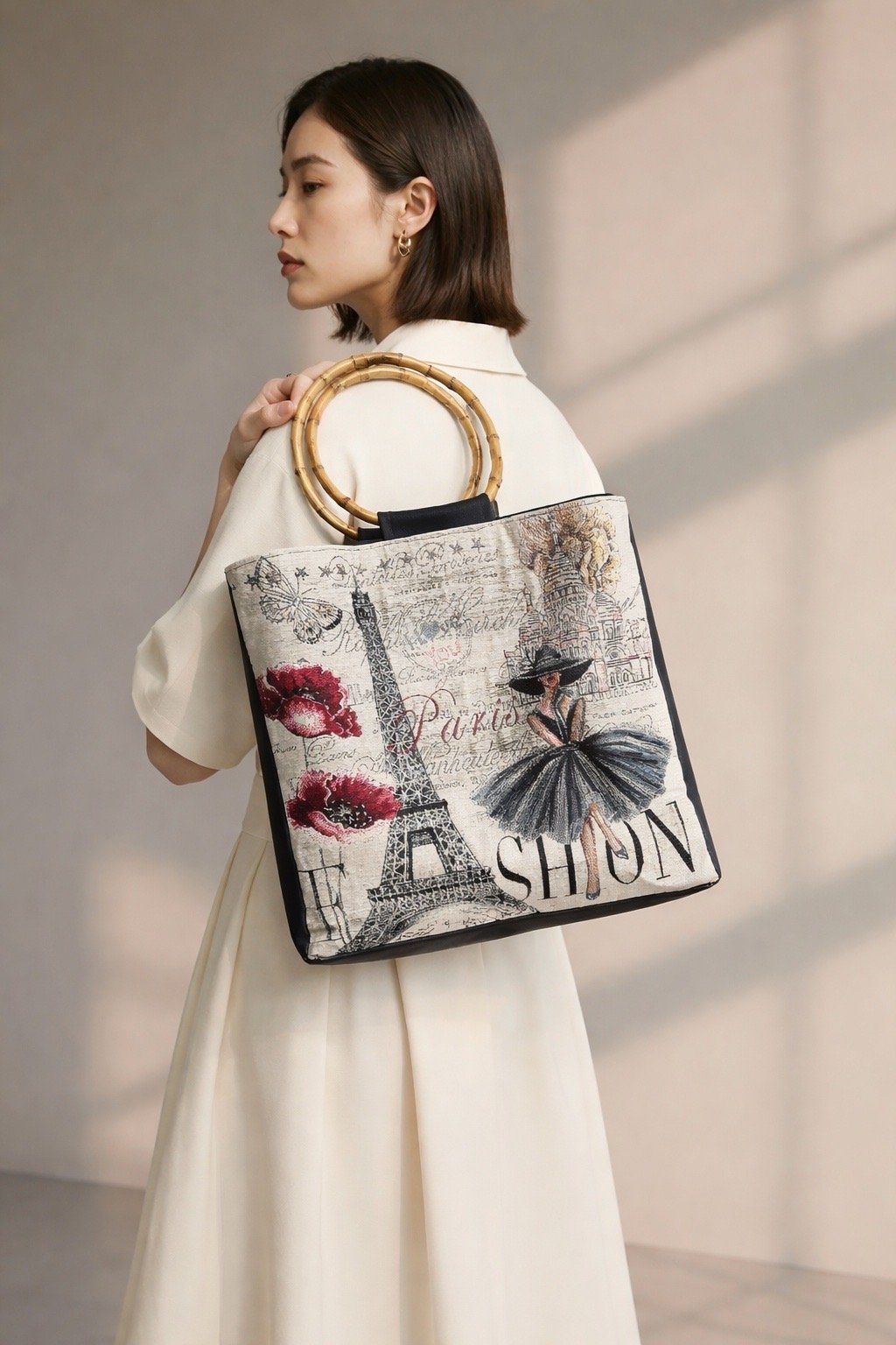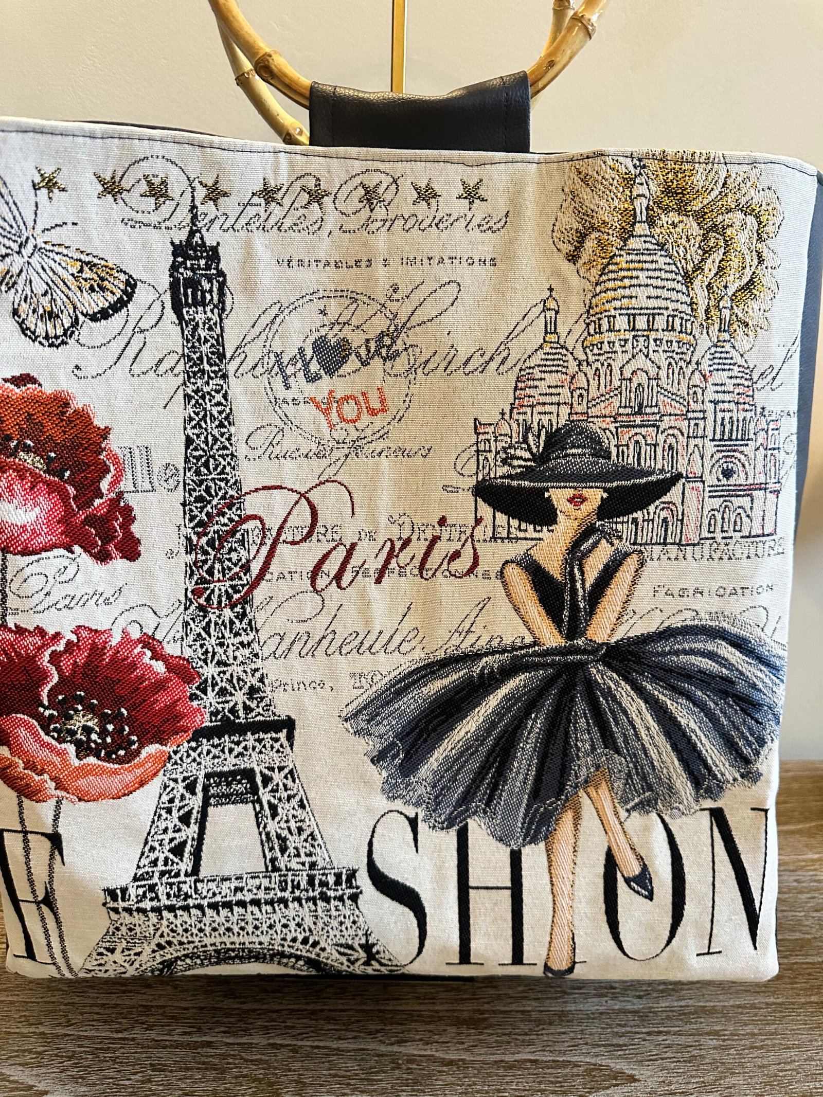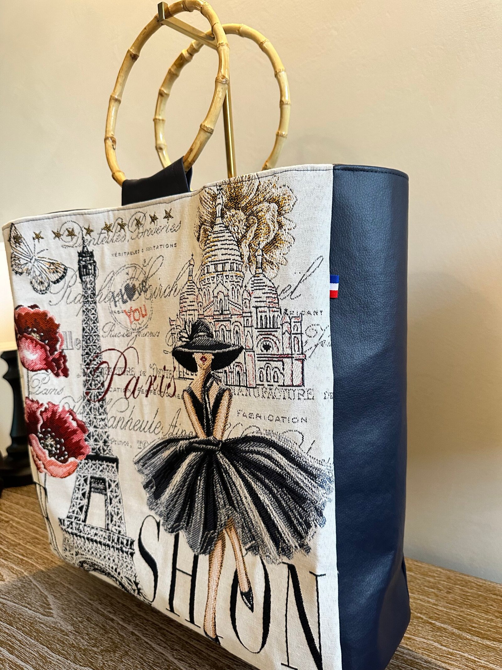 Sac femme simili cuir bleu marine Paris Tour Eiffel – Grand cabas chic avec anses rondes bambou